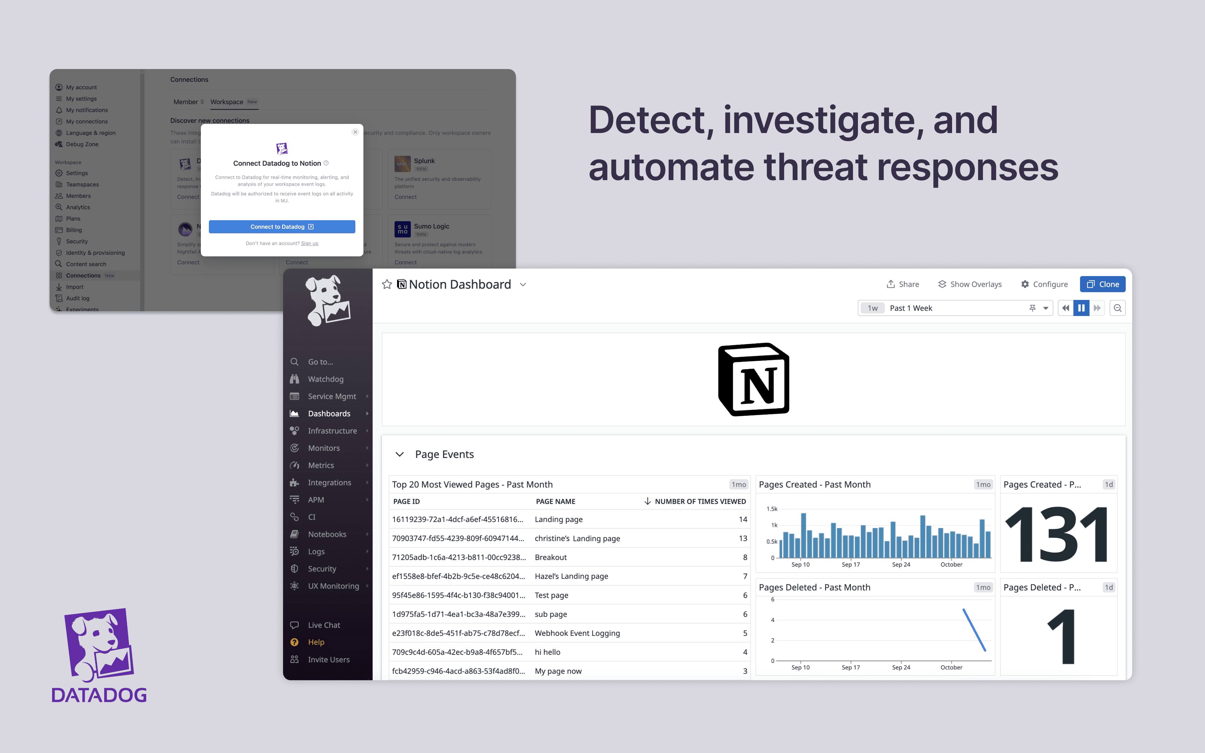 Install Notion's integration with Datadog to manage and monitor your workspace activity in Datadog Cloud SIEM. You can import your workspace's audit logs for real-time monitoring, alerting, and analysis. From there, you can detect and investigate potential security issues, suspicious behavior, and troubleshoot access with confidence and ease.